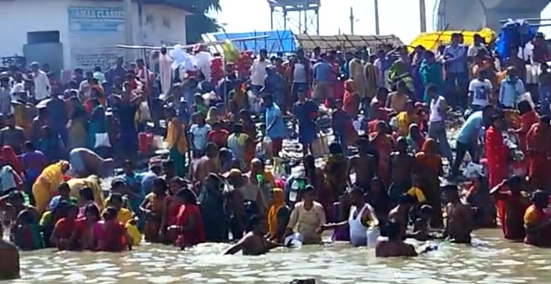 कद्दू भात के दिन नहाय खाय के लिए गंगा घाट पर स्नान के लिए श्रद्धालुओं की उमड़ी भीड़