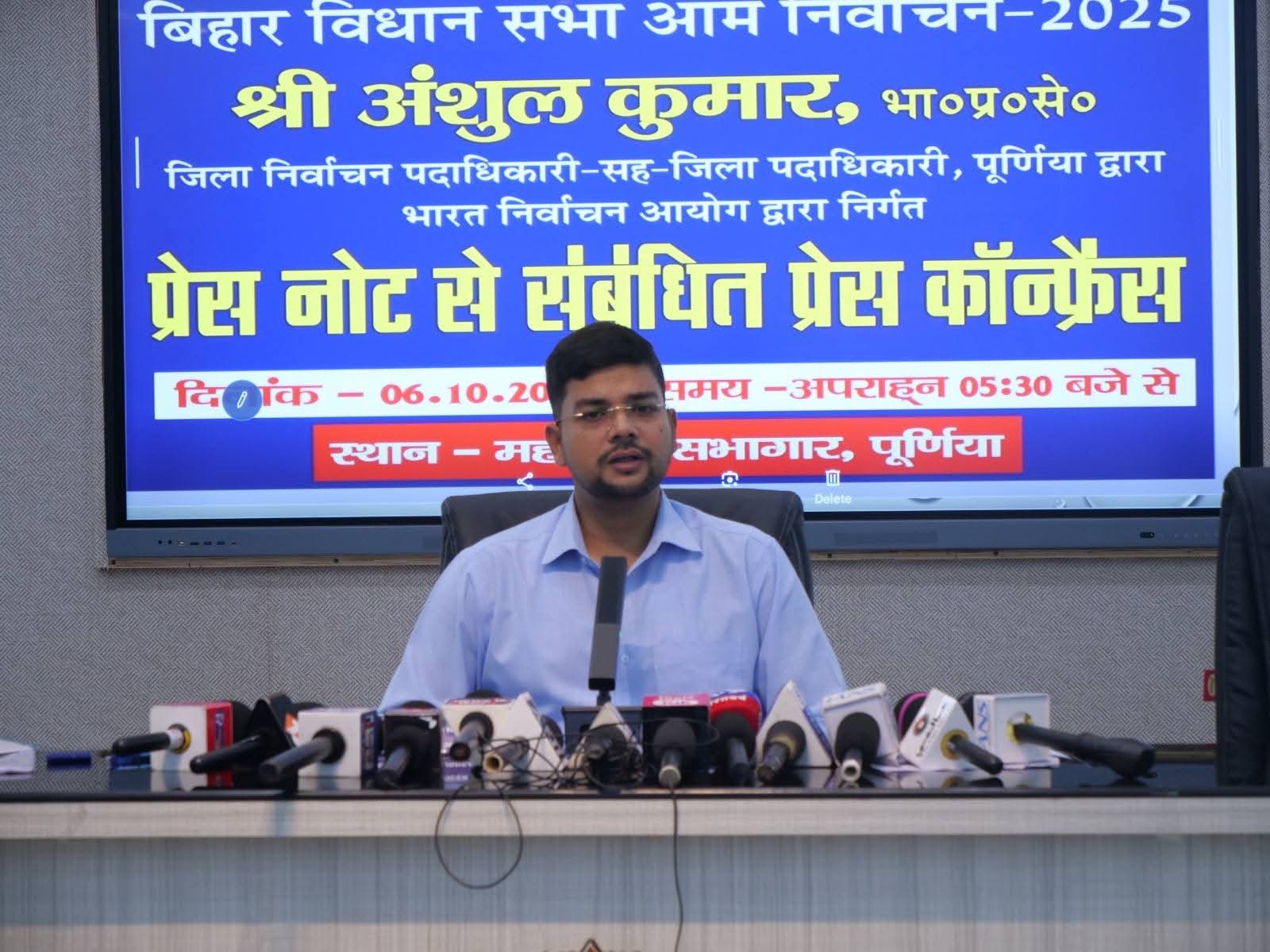 बिहार विधानसभा आम निर्वाचन 2025 के मद्देनज़र सोमवार को पूर्णिया के जिला निर्वाचन पदाधिकारी सह जिला पदाधिकारी श्री अंशुल कुमार (भा.प्र.से.) की अध्यक्षता में प्रेस कॉन्फ्रेंस आयोजित की गई।