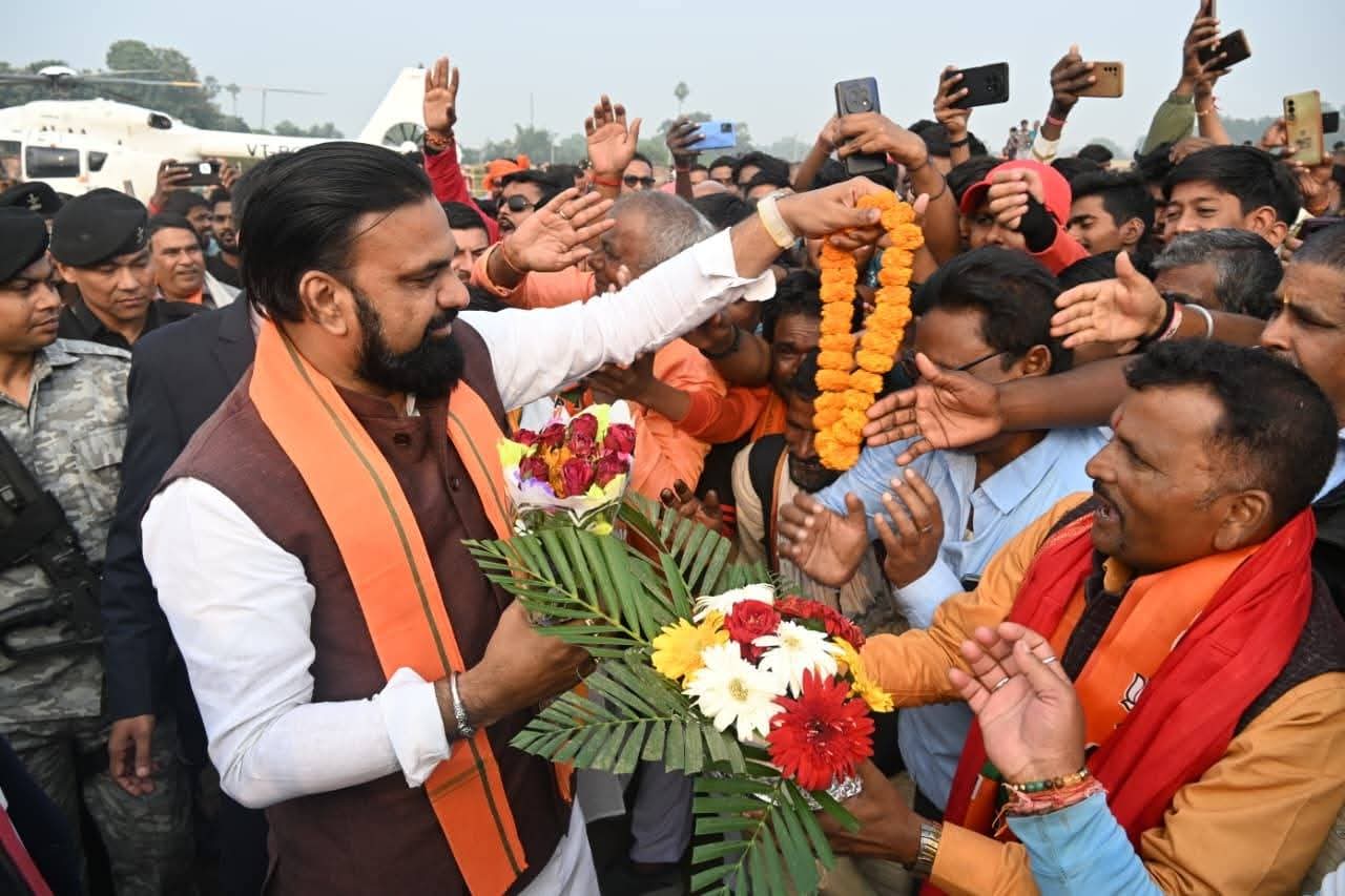 मुंगेर/तारापुर। बिहार के उपमुख्यमंत्री सम्राट चौधरी शुक्रवार को दो दिवसीय दौरे पर तारापुर विधानसभा पहुंचे। चुनाव जीतने के बाद यह उनका पहला आगमन रहा। संग्रामपुर में बने अस्थायी हेलिपैड पर जैसे ही उनका हेलिकॉप्टर उतरा, हजारों समर्थकों ने “सम्राट चौधरी ज़िंदाबाद” के नारों से उनका जोरदार स्वागत किया। मौके पर सुरक्षा के कड़े इंतज़ाम देखे गए।