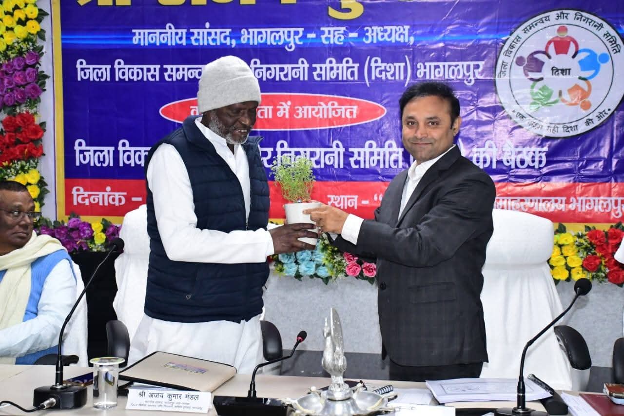 भागलपुर के समीक्षा भवन में माननीय सांसद श्री अजय कुमार मंडल की अध्यक्षता में जिला विकास समन्वय एवं निगरानी समिति (दिशा) की महत्वपूर्ण बैठक आयोजित की गई। बैठक में जिलाधिकारी डॉ. नवल किशोर चौधरी द्वारा सर्वप्रथम पौधा भेंट कर सांसद का स्वागत किया गया।