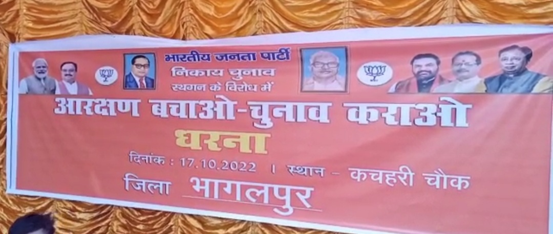 भागलपुर नगर निगम चुनाव को लेकर हाईकोर्ट के आदेश अनुसार चुनाव की तिथि अभी सुनिश्चित नहीं हुई है उस पर अभी भी ग्रहण लगा हुआ है इसी बाबत आज भागलपुर समाहरणालय के सामने भारतीय जनता पार्टी के द्वारा नगर निकाय चुनाव मैं आरक्षण खत्म करने और नगर निकाय चुनाव जल्द से जल्द कराए जाने की मांग को लेकर धरना दिया। धरना का नेतृत्व जिला अध्यक्ष रोहित पांडे ने किया।