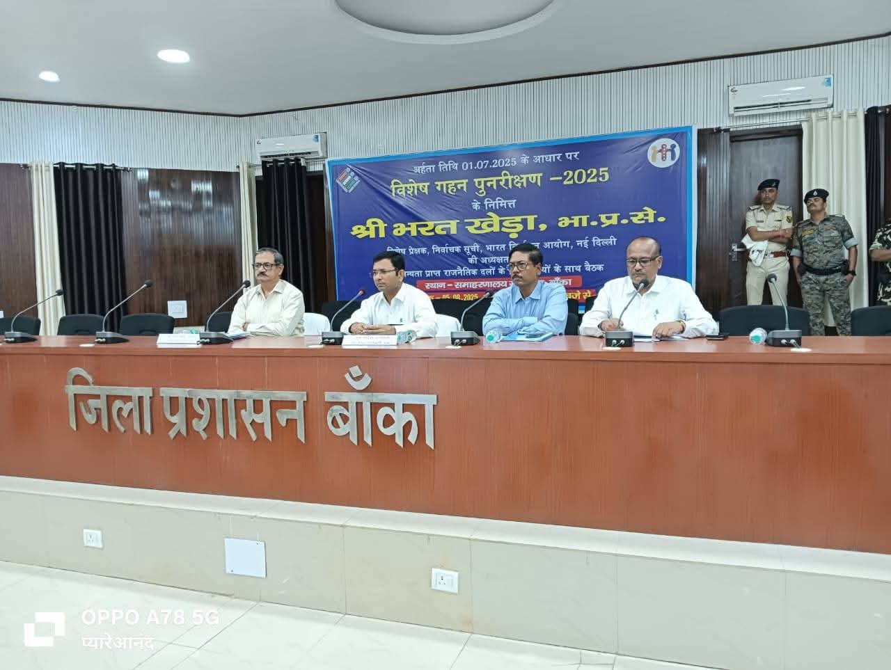 बांका – भारत निर्वाचन आयोग द्वारा नियुक्त विशेष निर्वाचक सूची प्रेक्षक श्री भरत खेड़ा (भा.प्र.से.) ने समाहरणालय स्थित सभागार में बांका जिले के सभी मान्यता प्राप्त राजनीतिक दलों के प्रतिनिधियों एवं जिला निर्वाचन पदाधिकारी-सह-जिलाधिकारी श्री नवदीप शुक्ला (भा.प्र.से.) के साथ विशेष गहन पुनरीक्षण 2025 को लेकर बैठक की।